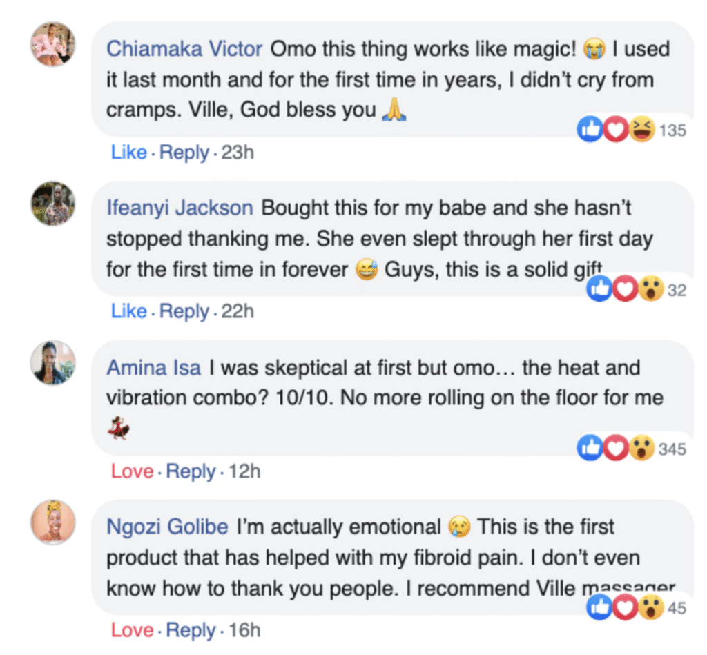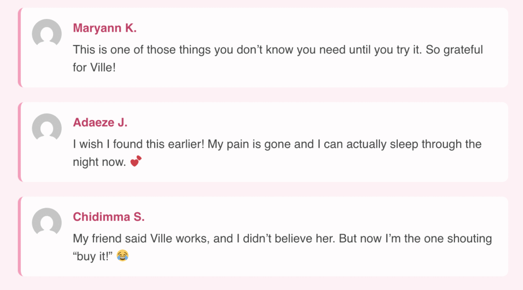 My teenage daughter used to cry every month from cramps. I hated seeing her suffer. Now, she straps on the VILLE Massager and goes about her day like nothing’s happening. No more drugs, no more tears.